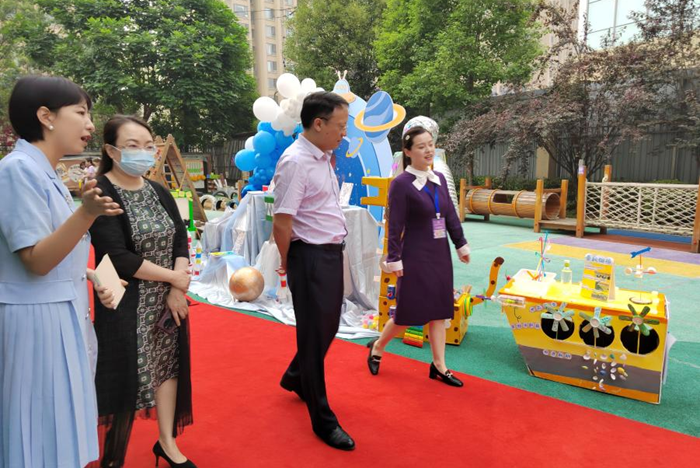 师生团队在城投教育集团副总经理孟红的陪同下,参观了幼儿园的游戏材料展示、师生特色区角展,感受到园区浓厚的天府文化元素和别具匠心的环创设计。